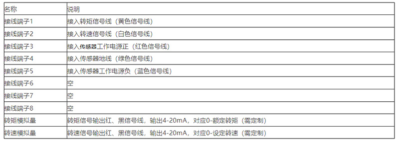 傳感器與測量儀接線: 設(shè)備前后板設(shè)有 8 個接線端子,各端子功能、接線要求及信號輸出規(guī)格如下表所示: