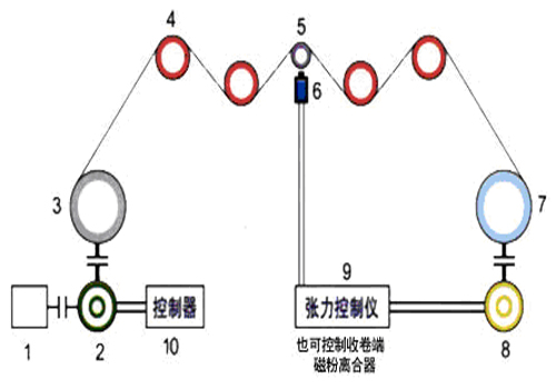 1-電機(jī) 6-張力檢測(cè)傳感器 2-磁粉離合器 7-放卷芯 3-收卷芯 8-磁粉制動(dòng)器 4-傳動(dòng)輪 9- ZK-1型自動(dòng)張力控制儀 5-張力檢測(cè)輥 10-控制器