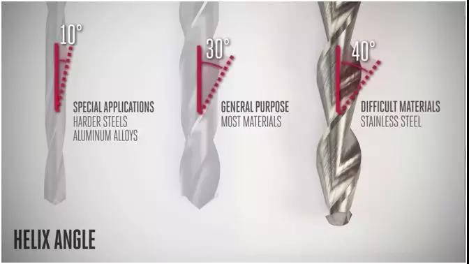對(duì)于絕大多數(shù)的材料來說30°的螺旋角度是個(gè)非常好的選擇。但是對(duì)于需要排屑更好,切削刃的強(qiáng)度更高的環(huán)境,可以選擇螺旋角度更小的鉆頭。對(duì)于難以加工的材料比如說不銹鋼,可以選擇螺旋角度更大的設(shè)計(jì)來傳遞扭矩。