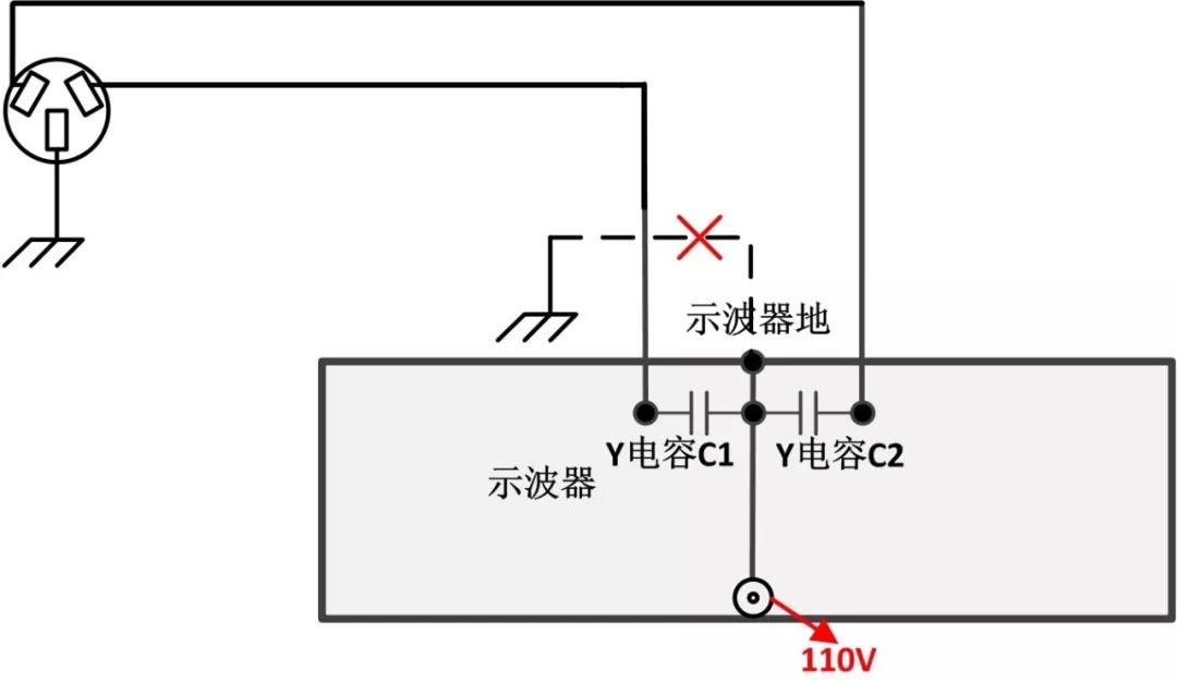圖6 示波器接地 由于Y電容的原因,導致原本的接地點電壓就不在是0V,而是L與N之間電壓的一半也就是110V電壓,這個電壓會對人體進行傷害。所以示波器的測量過程中,一定要保證接地良好,或者采用隔離變壓器進行完全的安全隔離,否則有可能會導致使用者觸電。 而且此時如果探頭的地線是接到了一個比較高的電壓上,比如說市電的火線上時,就會導致整個示波器外殼都帶有220V高壓,這時人再觸碰示波器時就會發生直接觸電,這種情況非常危險,相當于直接將手插入市電插排。