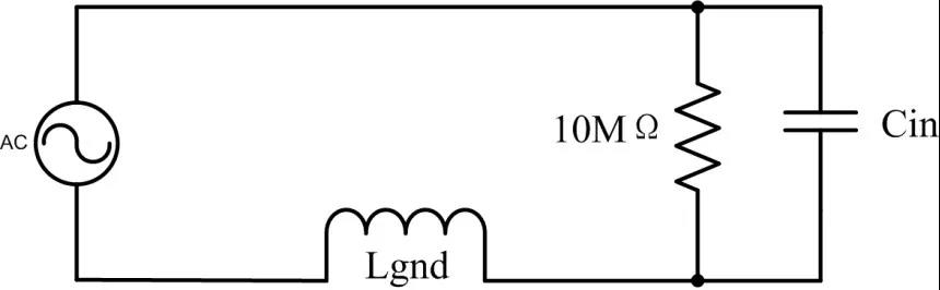 圖8 接地夾線示意圖 由于地夾線比較長,其會形成一個寄生電感Lgnd,隨著夾線的增長,這個電感也會增大,而這個回路電感會和示波器探頭的輸入電容Cin產生諧振。這就導致示波器的幅頻特性變得不平坦,導致測量不準確。下圖為使用接地夾時的等效電路。