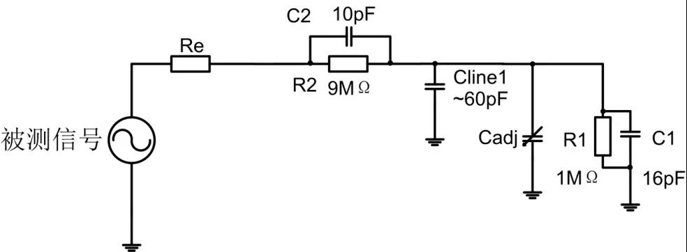 圖11 接地彈簧示意圖 而且使用彈簧,也會減小接地環路面積,大大較小空間噪聲的輻射干擾。 7、補償電容的調節 對于10×無源探頭,其等效模型如下圖所示。
