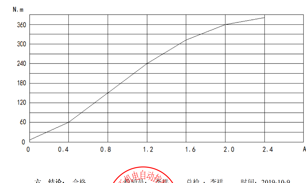 這是我公司200Nm磁粉制動(dòng)器加載測(cè)試曲線圖,額定轉(zhuǎn)矩200Nm,2.4A對(duì)應(yīng)加載轉(zhuǎn)矩381Nm,過(guò)載能力1.9倍。
