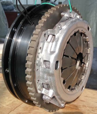 2017年,研制開發和雙離合器總成。將磁粉離合器與干式離合器組合成雙離合。1、3、5檔采用干式離合器,2、4、6檔采用磁粉離合器。當奇數檔換偶數檔時磁粉離合器預先結合(磁粉離合器可打滑工作)然后再松開奇數檔的干式離合器。此方案下汽車在自動換檔過程中無沖擊,無頓挫,駕駛舒適度高。