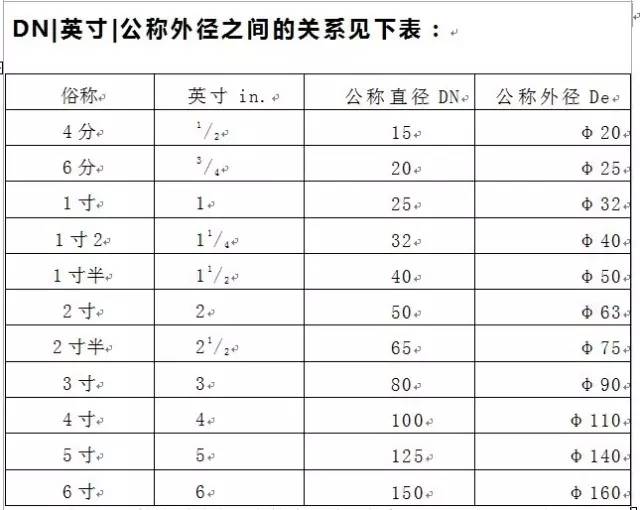 當設計均用公稱直徑DN表示管徑時,應有公稱直徑DN與相應產品規格對照表。